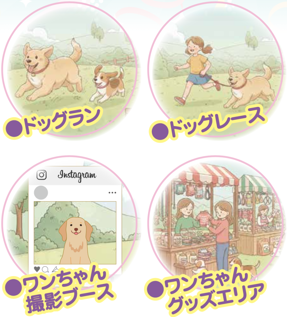 ドッグランやドッグレースをはじめ、マルシェ・フリーマーケット、キッチンカー、ワンちゃん撮影ブースやグッズエリアなど楽しい企画が盛りだくさん。